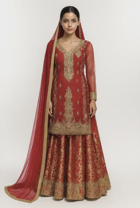 4pc Bright red Bansari print gold embroidery lengha & Sharara netting
