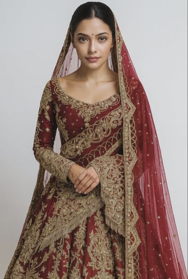 Deep Red & Gold Silk Embroidered Bridal Wear Trail Cut Lehenga