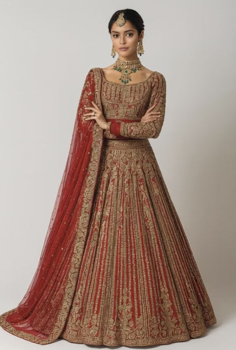 Extravagant Red & Gold Silk Embroidered Bridal Trail Cut Lengha 3pc