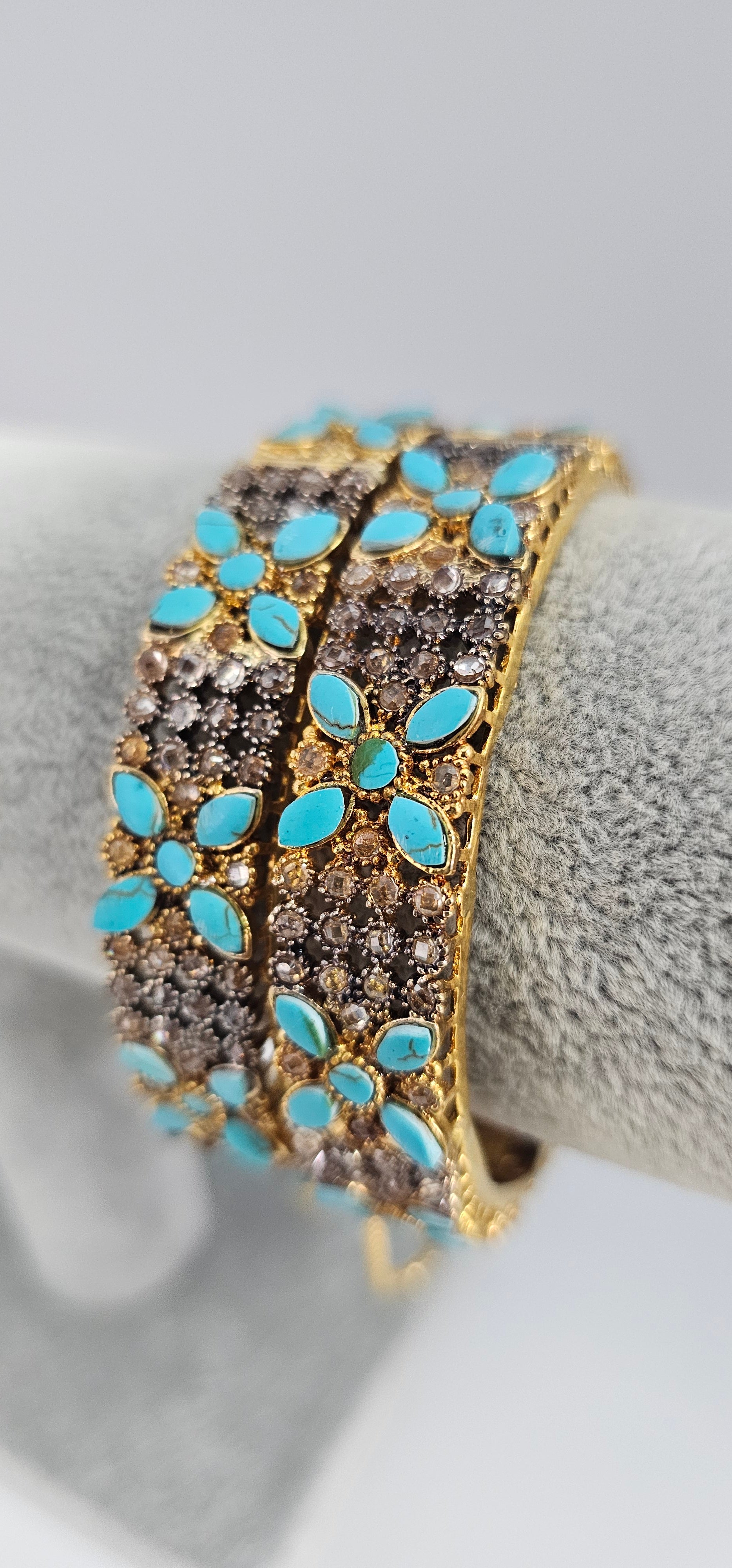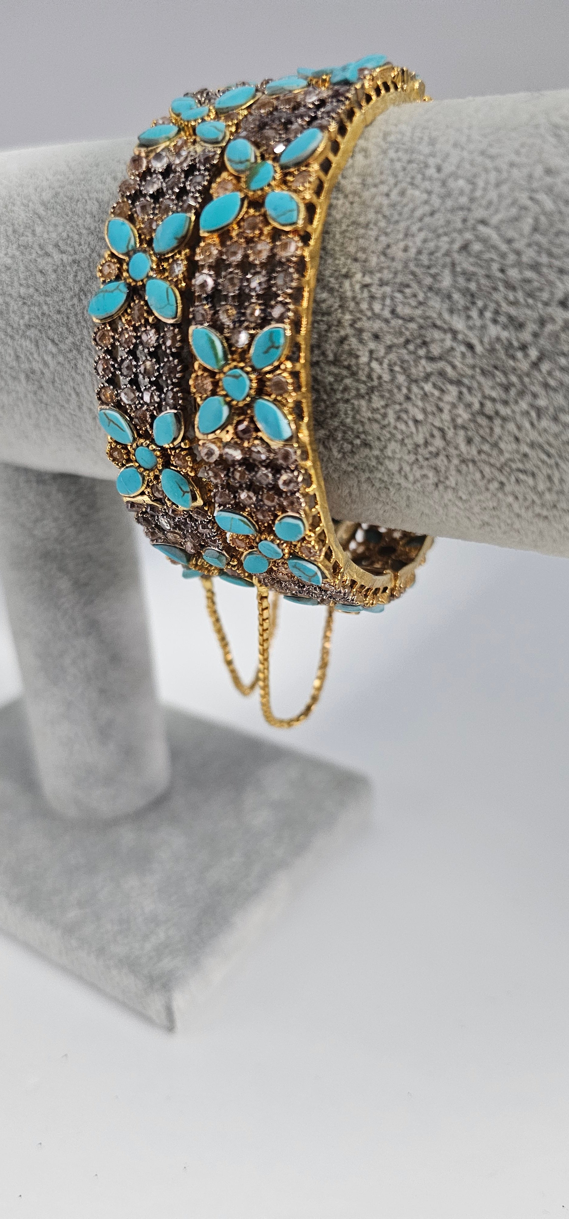 Indian Pakistani 2 Gold Plated Wide Kara Bangles With Ferozi Turquoise Stones Size 2.6